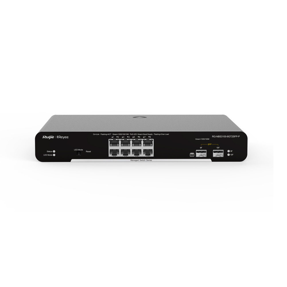 We're really sorry... We don't currently have that one in stock Please add your email and we'll notify you when it's back Email Home» Accessories» Power Over Ethernet Ruijie Reyee 10-Port Gigabit Layer 2 Cloud Managed PoE Switch (RG-NBS3100-8GT2SFP-P)Product ID RG-NBS3100-8GT2SFP-PPrice: £199.99 (£239.99 Inc. VAT)+- Add to cart« Previous | Next » • 10-Port gigabit Layer 2 managed non-PoE switch, 2 SFP uplink • Enterprise-class Quality Ensures High Performance • IP Camera Recognition, Unique Value for CCTV Network • Multiple Security Policies Protect Your Network • Lifetime management on Ruijie Cloud at anytime anywhere Product ReviewsNo Reviews For This Product.Click to review this product